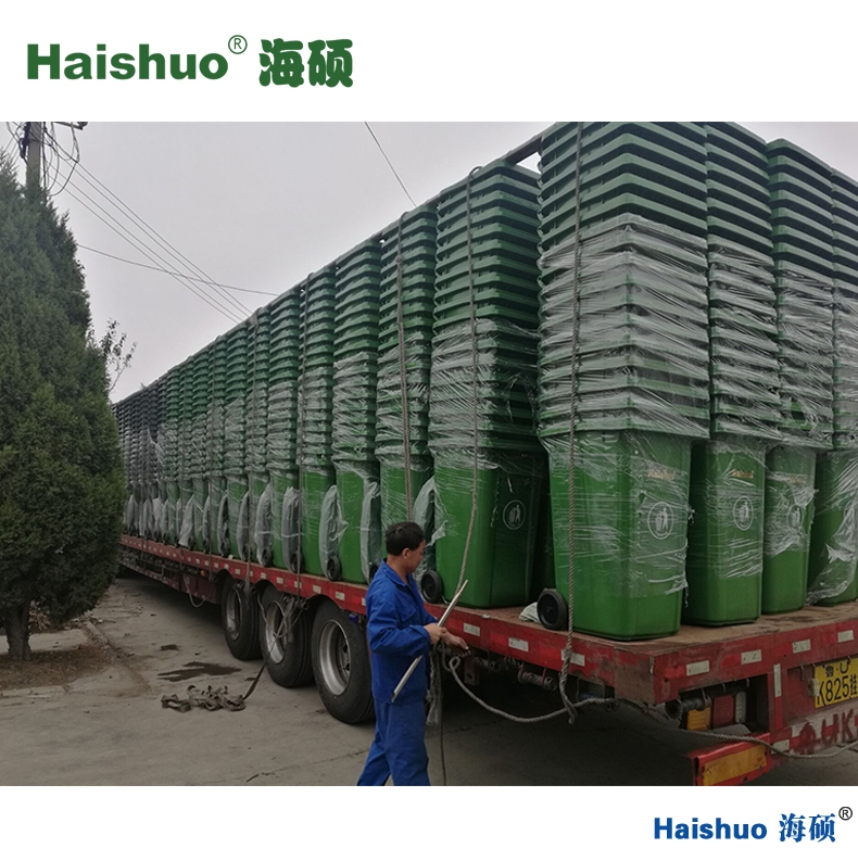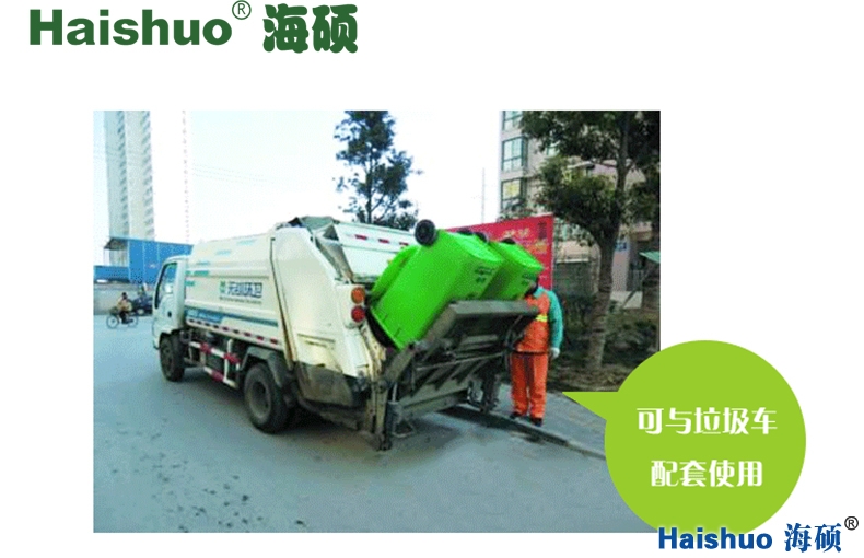青島海碩HS-180L環(huán)衛(wèi)垃圾桶,全面加強的桶身能夠配合汽車升降機,使掛車升降時不破損。