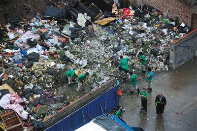 同樣,在朝陽區(qū)北工大附近某小區(qū)的一處垃圾處理中轉(zhuǎn)站,環(huán)衛(wèi)工人騎著環(huán)衛(wèi)車從四面八方趕來后,將車內(nèi)五顏六色的垃圾袋一股腦兒倒進垃圾壓縮機內(nèi)。破亂的垃圾袋撒出廚余垃圾等。這些被壓縮后的混合垃圾將在傍晚由環(huán)衛(wèi)車統(tǒng)一拉送至垃圾處理廠進行處理。