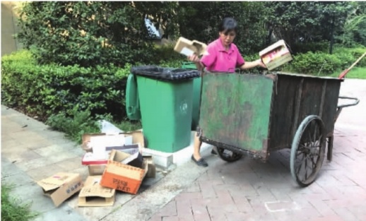 當(dāng)問及物業(yè)是否要求保潔人員對垃圾進(jìn)行分類處理時,他表示并沒有這樣的要求,個別保潔分類也只是將可賣物挑出自行變賣!耙环矫媸且?yàn)橛械木用癫]有做到垃圾分類,導(dǎo)致垃圾又混在了一起。另一方面是因?yàn)檫\(yùn)送垃圾的垃圾車就是一個大空間,沒有分類空間。還有就是垃圾中轉(zhuǎn)站也沒有垃圾分類放置設(shè)備,所以就算分類運(yùn)輸了,到垃圾站也還是要混合堆積的!