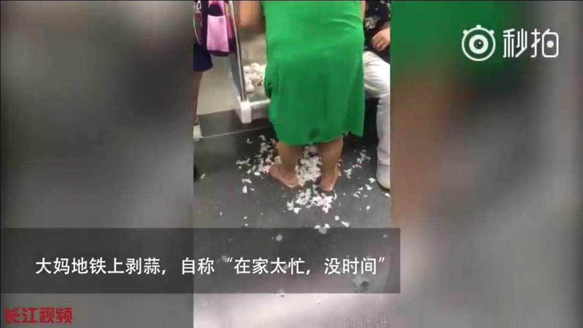 此前,武漢一位綠衣阿姨在地鐵三號(hào)線上剝蒜,白花花的蒜皮滿地都是。