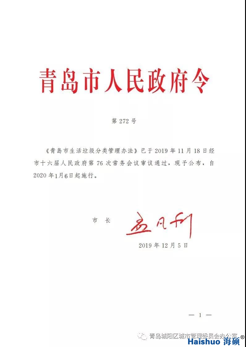 《青島市生活垃圾分類管理辦法》已于2019年11月18日經(jīng)市16屆人們政府第76次常務(wù)會(huì)議審議通過,現(xiàn)予發(fā)布,自2020年1月6日施行。