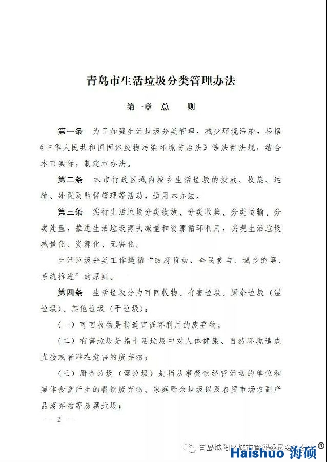 《青島市生活垃圾分類管理辦法》自2020年1月6日施行