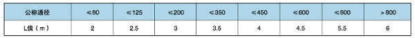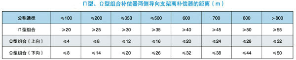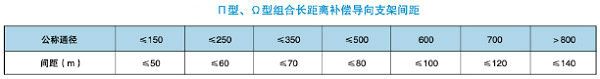 因旋轉(zhuǎn)補(bǔ)償器的補(bǔ)償量特別大,所以固定支架間距也隨之增大,其間距一般由設(shè)計(jì)管段的補(bǔ)償量大小決定,為避免長距離管道撓曲失穩(wěn),需在一定距離內(nèi)安裝導(dǎo)向支架,同時(shí)為減小管段運(yùn)行的摩擦阻力,在導(dǎo)向支架上應(yīng)安放滾動(dòng)支座,導(dǎo)向支架間距如下表:圖(8)